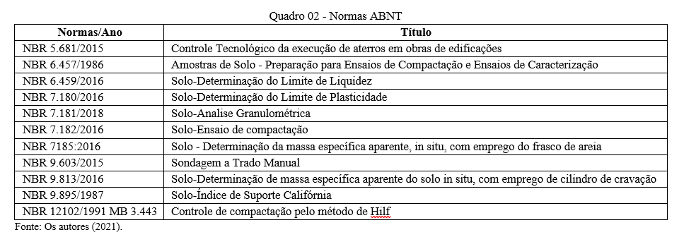 São requisitos legais aplicáveis às obras de terraplenagem convencionais e no Brasil, as Normas estabelecidas pela Associação Brasileira de Normas Técnicas (ABNT) e pelo Departamento Nacional de Estradas de Rodagem (DNER), as quais contemplam respectivamente o disposto nos quadros 02 e 03.